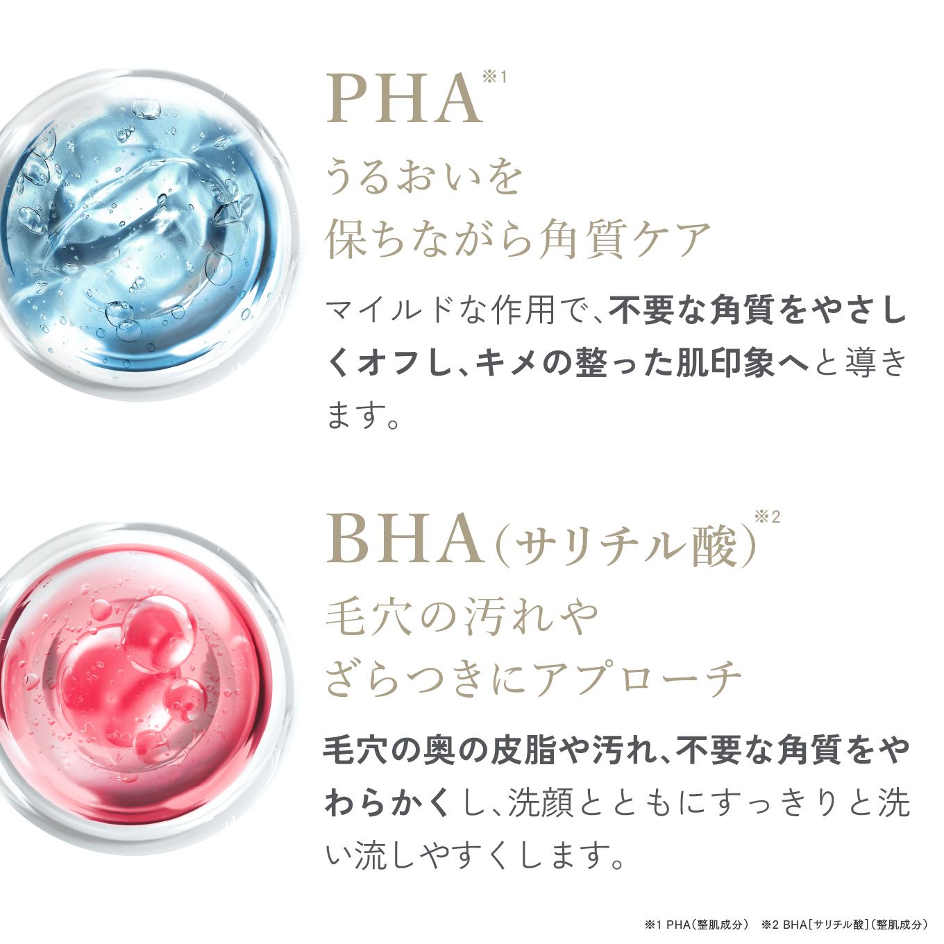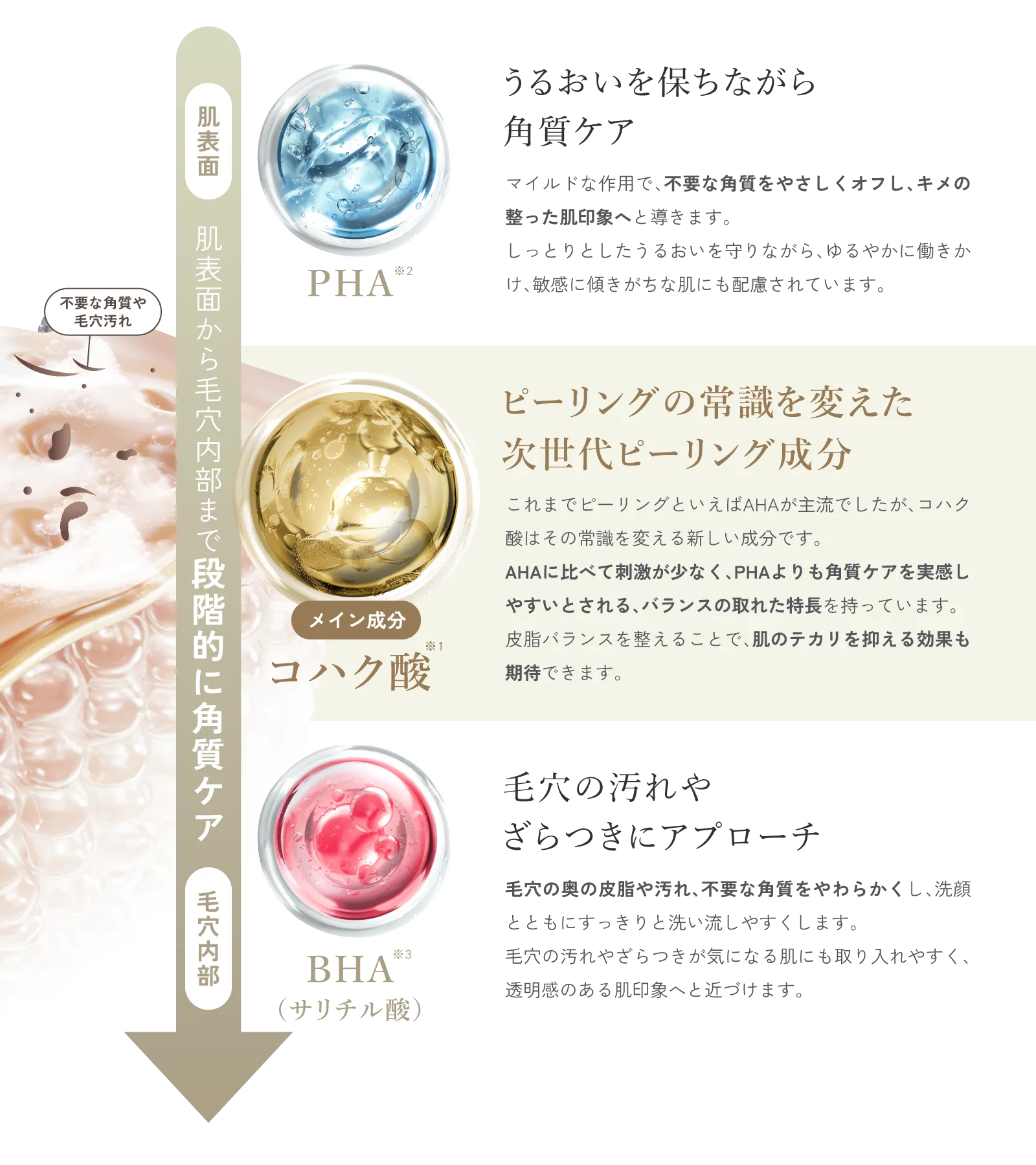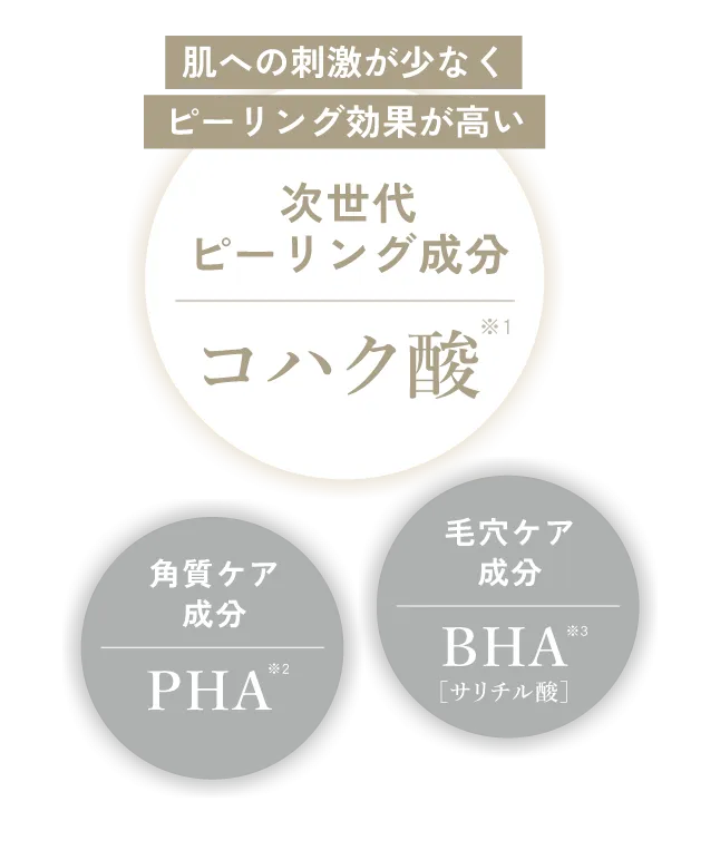 次世代ピーリング成分のコハク酸※1に加え、PHA※2・BHA※3を配合。配合濃度にこだわり、不要な角質や毛穴汚れを効果的にやさしくオフ。