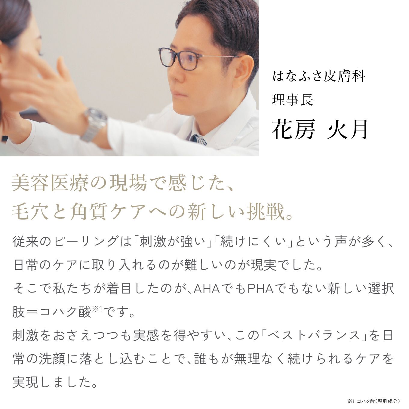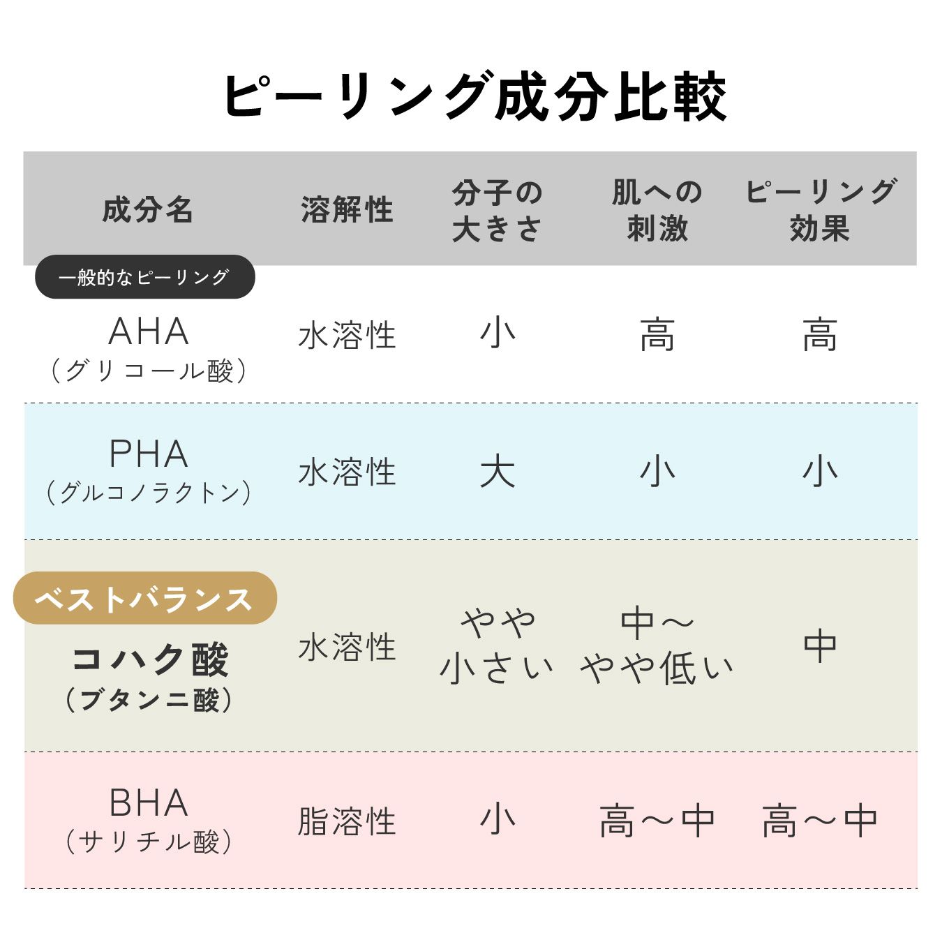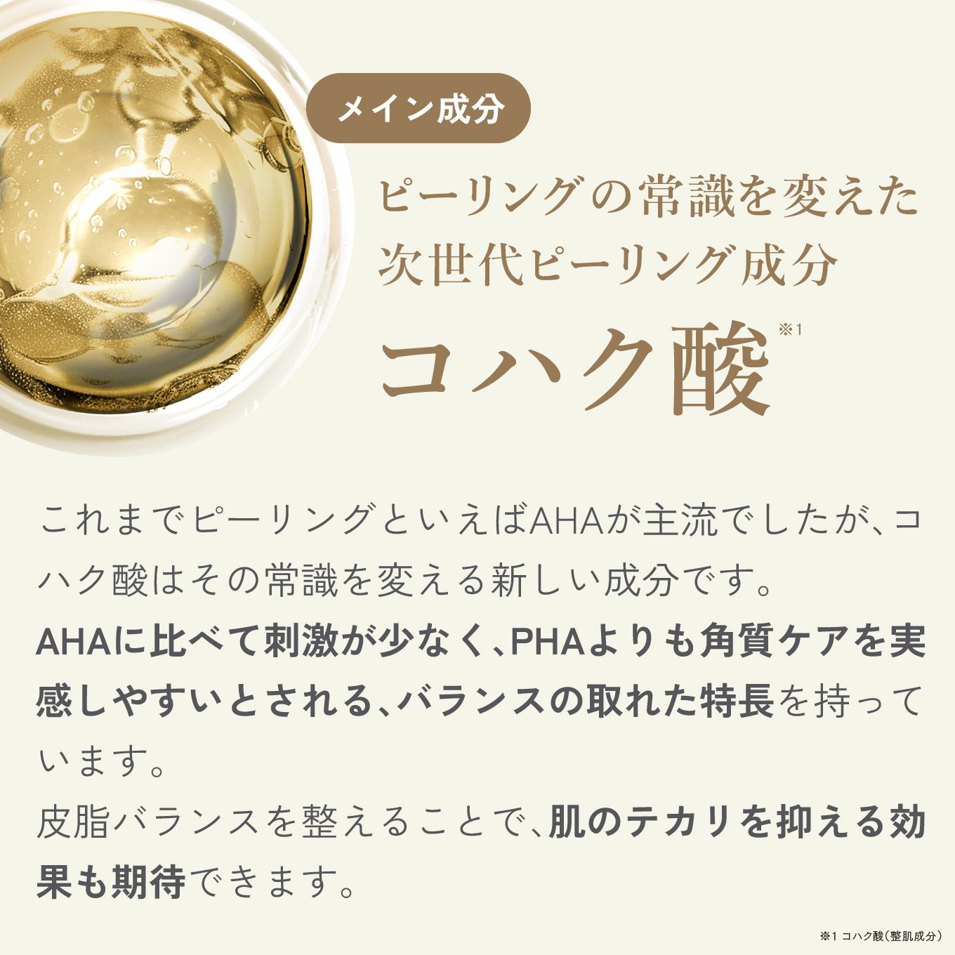 次世代ピーリング成分のコハク酸※1に加え、PHA※2・BHA※3を配合。配合濃度にこだわり、不要な角質や毛穴汚れを効果的にやさしくオフ。