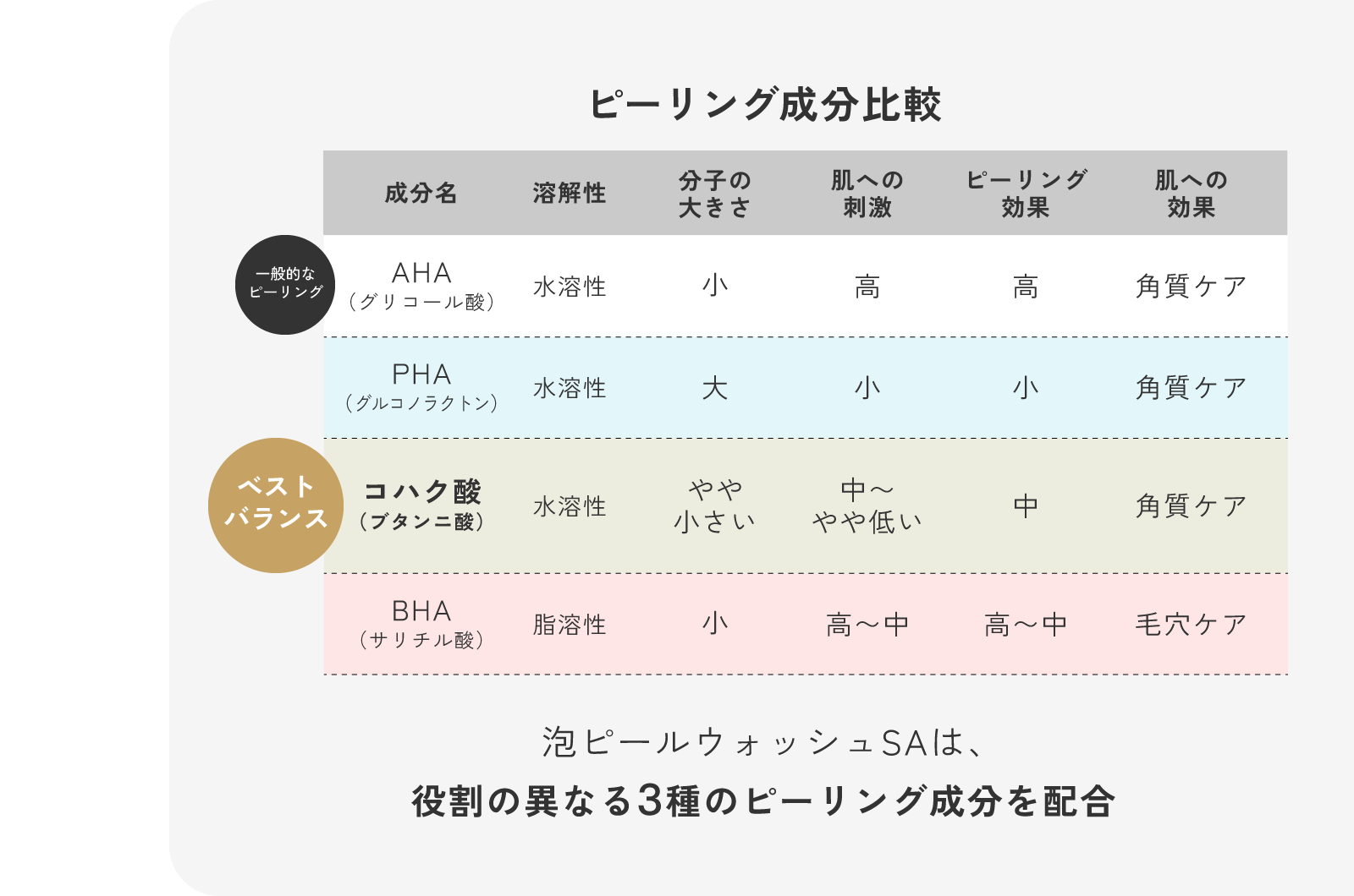 泡ピールウォッシュSA開発において、ゆらぎやすい肌でも日常使いできる製品として、次世代ピーリング成分の”コハク酸”、それぞれ役割の異なるサリチル酸、PHAの配合濃度にこだわりました。