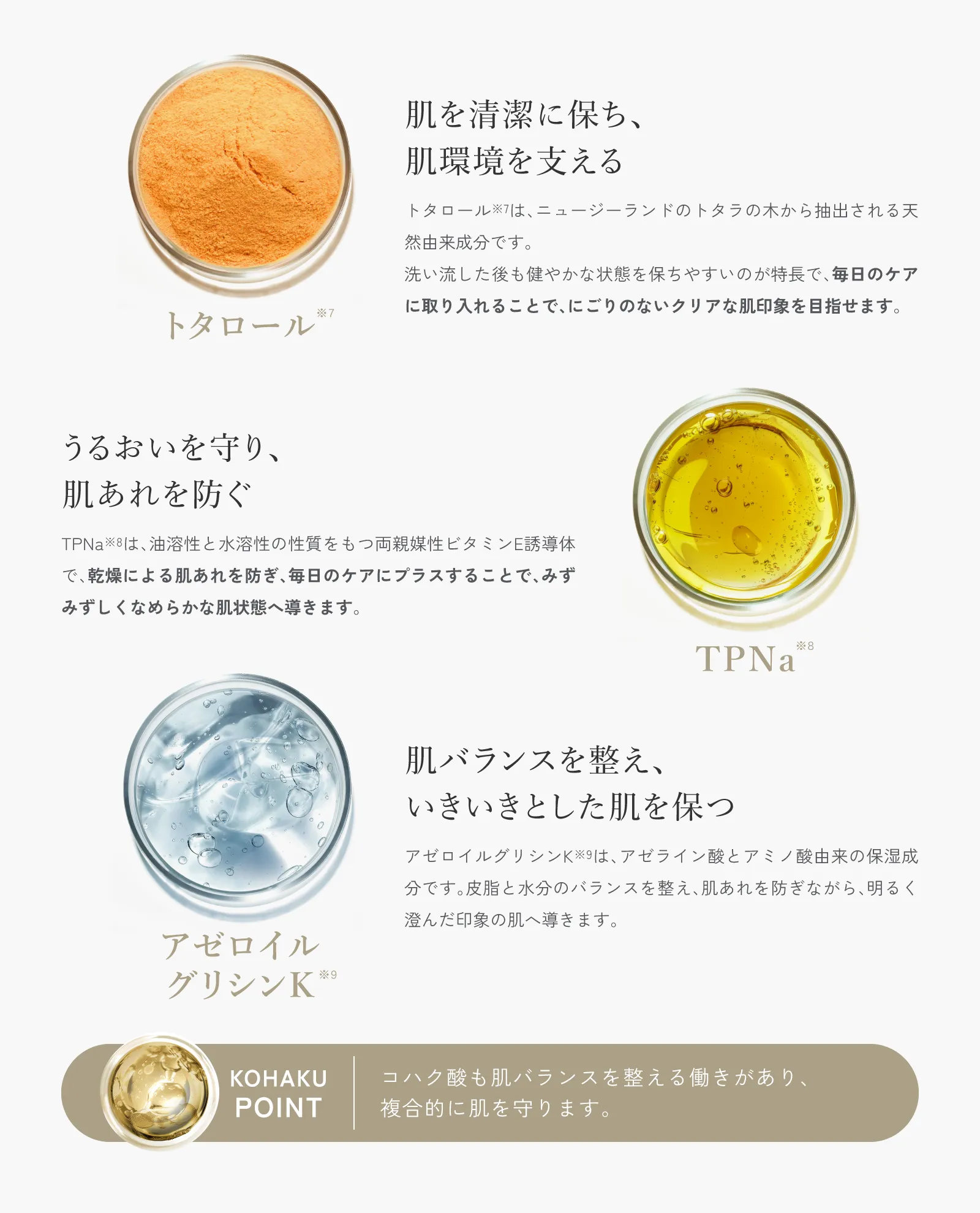 肌を清潔に保ち、健やかな環境をサポートするトタロール※7と、肌あれなどのトラブルを防ぐTPNa※8を配合。
