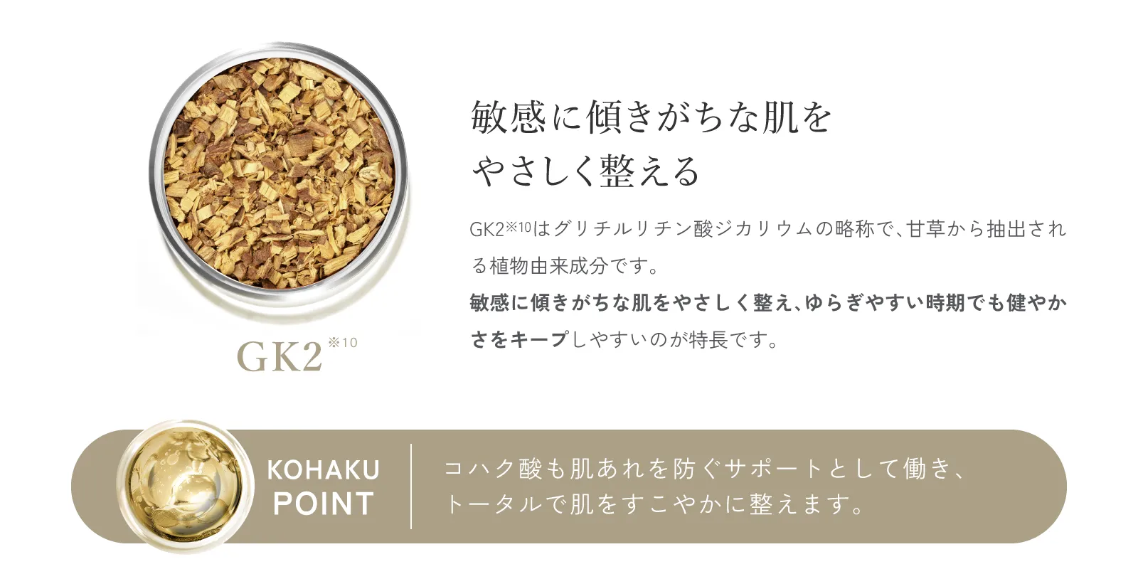 GK2※10が、乾燥や外的刺激による肌あれなど、様々な肌トラブルの原因を根本から抑え、強く美しい肌の土台をつくります。